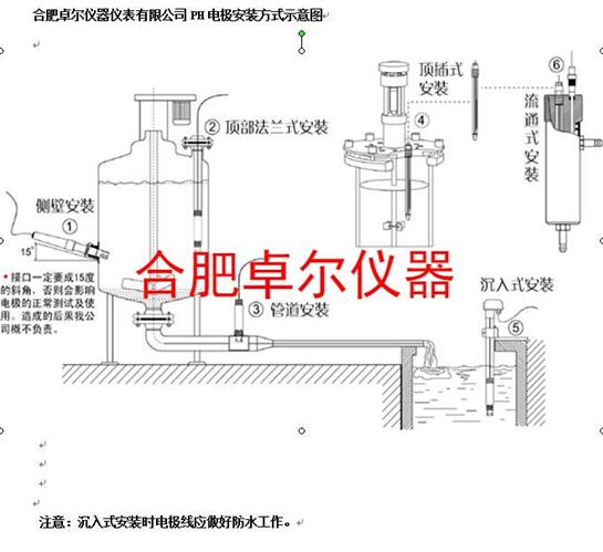 1. PH電極安裝應(yīng)使用電極安裝支架或流通杯。(適用于沉入式安裝或流通式安裝)。請(qǐng)不要把PH電極直接投入水中。